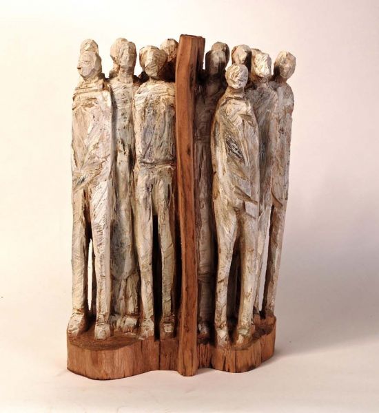 Sieglinde Gros bleibt in ihren Arbeiten durchwegs auf den Menschen bezogen. Auch wenn die Stellen noch so abstrakt erscheinen, das Terrain der völligen Abstraktion hat die Künstlerin nie betreten. Mit minimalistischen Eingrien wird stets eine anthropomorphe Gliederung angestrebt. Dabei variieren die Bearbeitungstechniken von einer stark reduzierten Gegenständlichkeit zu einer deutlich herausgearbeiteten individuellen Physiognomie in den aktuellen Porträts. Nie hat man bei Sieglinde Gros den Eindruck, dass sie versucht die Materie zu bezwingen, indem sie ihre spezischen Eigenschaften völlig negiert. Harte Konturen, schartige Kanten oder integrierte Holzsplisse kennzeichnen ihre Arbeiten. Primär lässt sie sich vom Holz leiten, von seinem Wuchs, seiner strukturellen Besonderheit und erst im Arbeitsprozess wird das ungefähre Motiv zum schlüssigen Konzept.